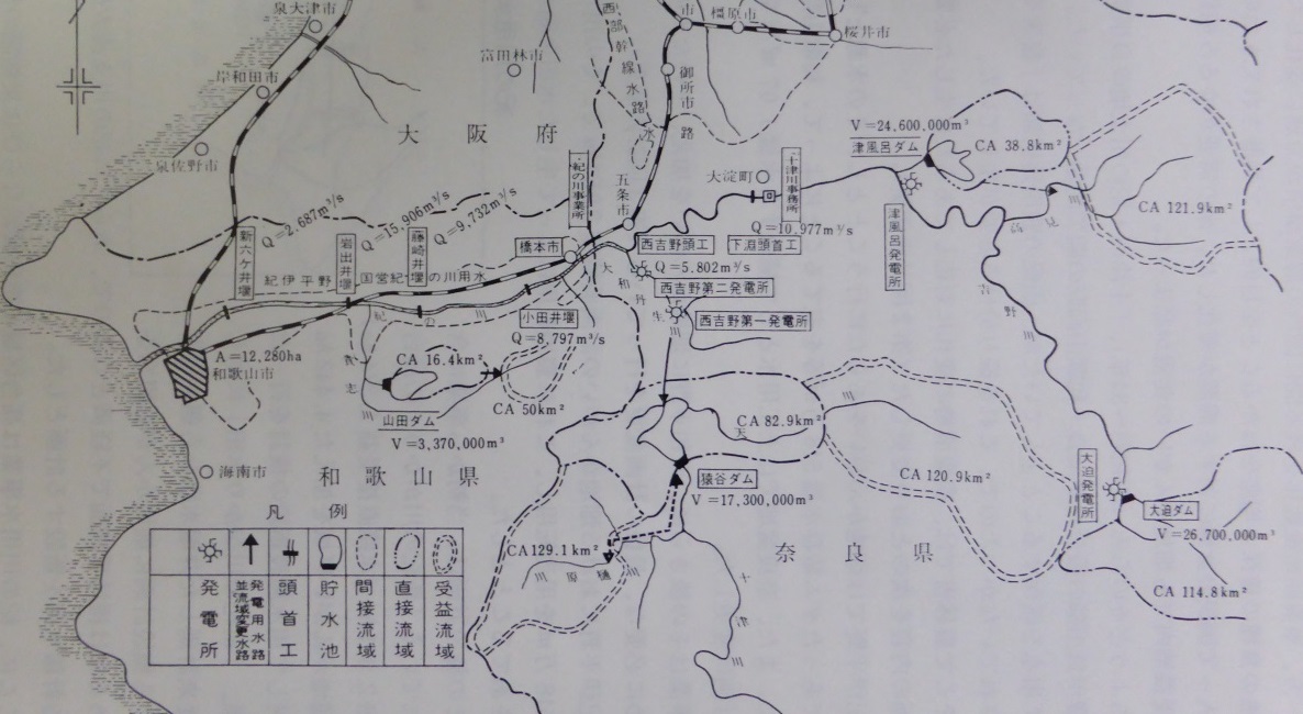~貴志川~[→開発篇] 25.10時点で,有田川を見に行った時にちらっと見たのみ。 ![]() 上流には山田ダムが,下流には諸井堰がある。 ![]() 諸井堰 ~野田原川~ 山田ダム[便覧][川 の防災情報][遍路] 河川 紀の川水系野田原川 目的/型式 A/重力式コンクリート 堤高/堤頂長/堤体積 34m/139.4m/45千m3 流域面積/湛水面積 16.4km2 ( 全て直接流域 ) /35ha 総貯水容量/有効貯水容量 3400千m3/3370千m3 平常時最高貯水位:93.60m ダム事業者 近畿農政局 着手/竣工 1950/1957 諸元からお解りの様に全て直接流域の様である。 しかし,綜合開発事業概要図に寄ると貴志川本流上流(真国川と呼ばれて いる様だ)50km2を流域とする導水計画があったようである。開発篇で言々 開発と合わせて検討した。 ![]() |