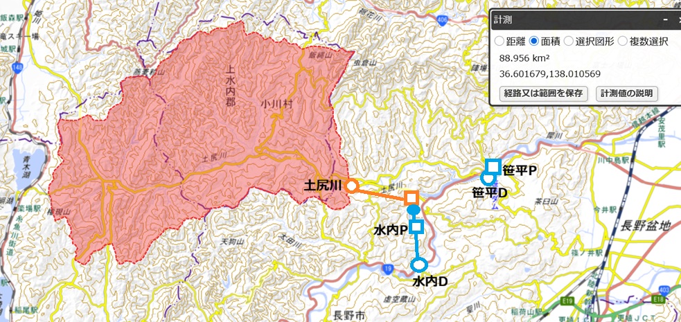 | 未利用落差を埋めてみる。普通に良いの出来た♪ [試案]信州新町発電所 発電量:27,700kW[+27.7MW] 有効落差:25m 水量:130m3/s 導水:4.5km 取水:犀川[信 州新町ダム(この辺)・平発電所放水口]456.5m 放水:犀川[水内ダム(放 水口・この辺)]435m |