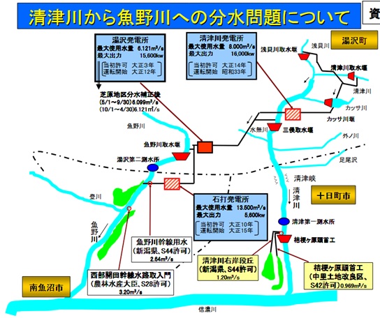 【湯沢発電所水利権問題】 この二居川ダム(仮称)で安定させた水量,湯沢の水量増やすならメリットありである。諸 元か らなんとかなり余裕を 持った19,440kWの水車能力があるのに今で は156,00kWしか使ってないのである。 [増強案]湯沢発電所 認可最大出力: 156,000kW→19,440kW[+3.84MW] 最大使用水量: 6.12m3/s→8.0m3/s 弱 有効落差:301.49m 水車:総出力19440kW 導水路:総延長6798.6m 取水:清津川発電所、清津川630.86m 放水:魚野川312.2m 流石,有効落差300mはでかいなあ〜。 で,変に余裕のある水車の出力容量だけど昔はもっと大量に取水してたけどなんかの原因で取水出来なくなったとかないよね?? 出来れば二居川の水はダムで貯めて安定化(と同時に水量の確保にも成ってゐる)して湯沢に送りたい・・。そもそも今より清津川の流れが減っても大丈夫やろ か・・。 |