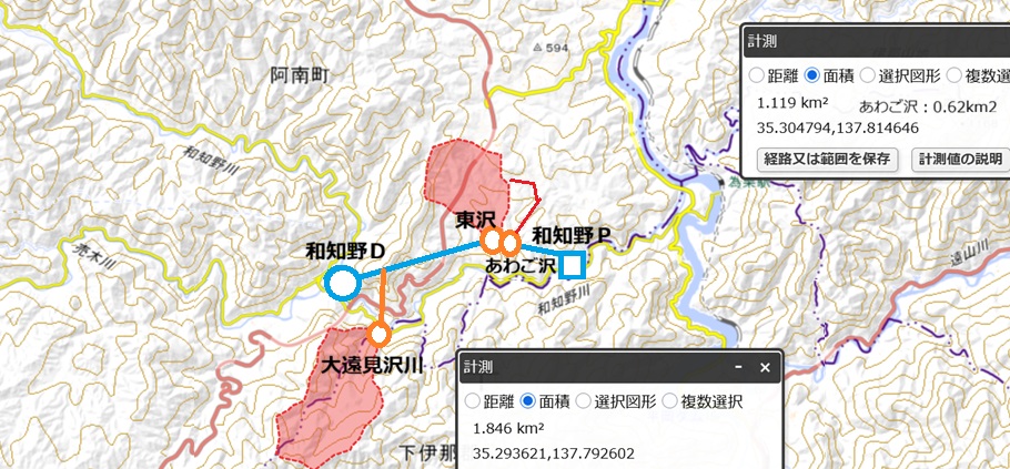 <ボツ案>EL.840mで取水して豊発電所売木川取水堰で発電出来そう。31.0km2である。水量 3.8m3/s・落差104mとすると3,300kWである。もう一声欲しい感じではある。。 鈴ヶ沢川上流からも取水すると8.85km2追加で,4.9m3/s程度,4,200kWか。あともうちょい欲しいなあ。。 ![]() [私案]売木発電所 出力:4,300kW[+4.3MW] 水量:4.9m3/s 落差:104m 流域:39.8km2(=30.95+8.85) 導水:2.0+1.5(鈴ヶ沢)=3.5km+4.3km(売木川・軒川) 取水:売 木川(道洗沢川)・軒 川・岩倉川[岩倉ダム]・(鈴ヶ沢川[堰堤])840m 放水:売木川[豊発電所]732m 豊発電所の売木川取水堰では今は1.98m3/sしか取水していないので当然取水量増が必要で二倍以 上と なると導水管の増設が必要になろうか。 上で指摘したように下流の豊発電所・和知野発電所ともに増強が可能であろう。 [増強私案]豊発電所(2号機増設) 発電所総出力:43,300kW[+28.8MW (2号機出力)] 発電所最大使用水量:16.54m3/s [+11.0m3/s(2号機使用最大水量)] 有効落差:304.83m 導水路:総延長13008.7m(平行して新設・上部水槽やサージタンクなどは共用)[導水距離発電力比は0.5である。只発電力を厚めに取っての数 字。] 流域面積:129.5km2 取水:和 知野川(調 整池?)、売 木川[岩 倉貯水池(調整池)]、他(本 谷川/心 川,鈴ヶ 沢川,辺りか?) 計7箇所[DB②] 732.0m 放水:和知野川[和知野川ダム直上]405.08m [増強私案]和知野ダム=保留 流域:165km2 和知野ダムを嵩上げするに際して,松二等を参考に水面下でも放水出来るとして満水位410mに設定すると立ち退きが必要になるのは豊発電所に隣接する家な ど数軒[す とび] ただ大した量は貯水出来ない。要検討。 3m程嵩上げして400mなら立ち退きも不要かも。 ![]() [増強私案]和知野発電所(和知野発電に2号機増設案) 発電所総出力:14,400kW[+8.1MW(2 号機出力)] 発電所最大使用水量:21.50m3/s [+11.0m3/s(2号機使用最大水量)] 有効落差:86m 導水路:総延長3.4km(平行して新設・上部水槽やサージタンクなどは共用)[導水距離発電力比は0.5である。只発電力を厚めに取っての数字。] 放水路:1.5km 取水:和知野川[和知野ダム]400.00m→2号機を新設するなら今より嵩上げして400m程度取水出来る様にはしたい。。 放水:天竜川[平岡ダム]309.0m(平 岡ダム端迄放水路を延ばして落差を稼ぐ) もっと下流にダムを建設して貯水量を稼ぐ方法もあり得る。 [私案]新和知野ダム[場 所] 堤高:60m程? 堤頂長:136m 湛水面積:29.8ha 取水位:380~400m 貯水量:約400万m3 ![]() [新設私案]新和知野発電所(離れた場所に新設案) 発電所総出力:8,100kW[+8.1MW] 発電所最大使用水量:11.0m3/s [+11.0m3/s] 有効落差:86m 導水路:3.5km 取水:和知野川[和知野ダム]400.0m→2号機を新設するなら405mから395m位迄取水出来る様にはしたい。。 放水:天竜川[平岡ダム]309.0m(平 岡ダム端で発電。) |