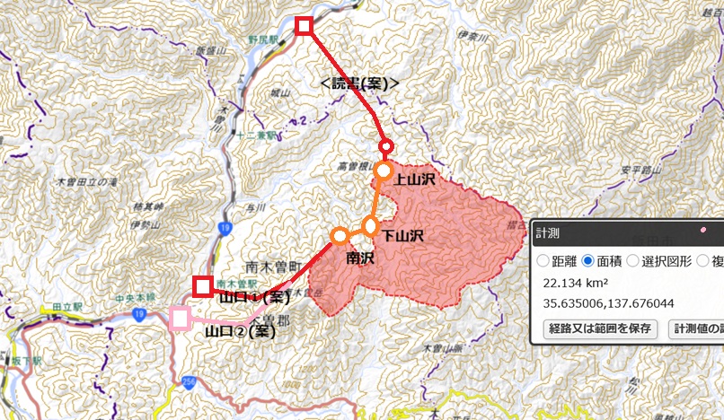 【開発篇】 ▲ さて,上流から22km2程奪って発電してしまっても,与川発電所の1.67m3/sは残る22km2程度から取れば良いので無問題である。 上流部から読書に持っていくか山口に送るかの選択である。諸元は以下の様になった。 ![]()