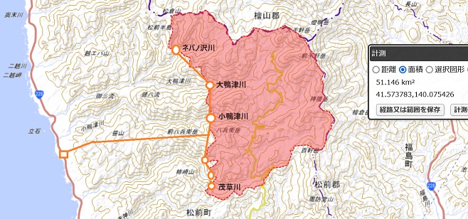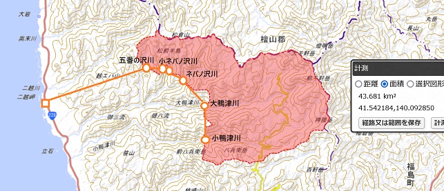 大野ダムと同じレベルで取水すると26.7km2程取れる。EL.310m。
