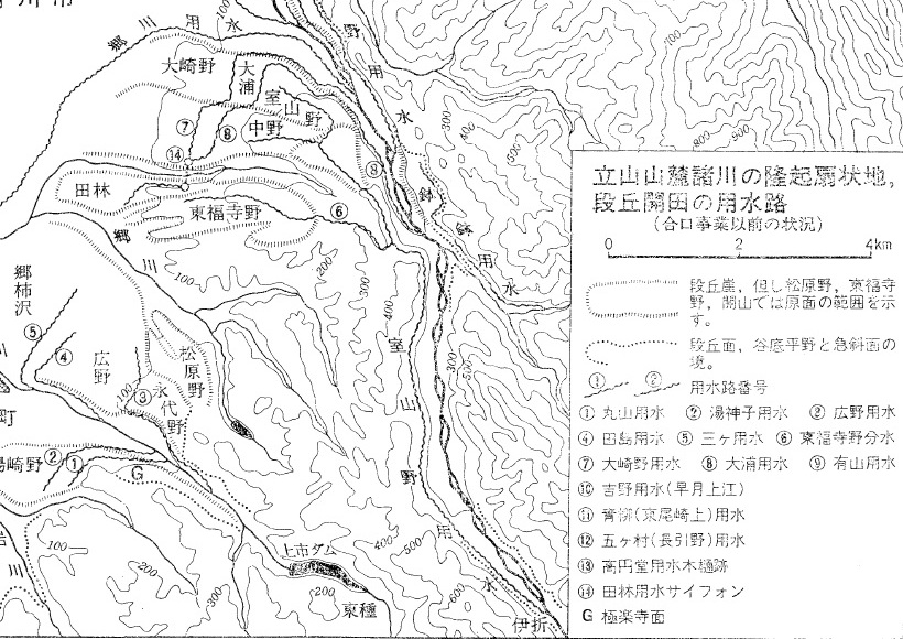 一番の問題は室山野用水・東福寺野用水の取水量である。 1977 年の竹内氏の論 文『富山平野における隆起扇状地の水田造成と灌漑について』によると室山野用水は室山野・中野・東福寺野を潅漑し,室山野用水の潅漑面積は 291haとのことで結構広い。 ![]() 水系模式図に拠ると直ぐ脇の大崎野と大浦両用水の潅漑 面積と供給水量の関係はこんな感じとなる。