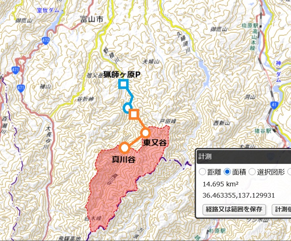 ▲ [私案]野積川発電所 出力:4,900kW[+4.9MW] 水量:2.5m3/s[1.7] 落差:230m 導水:3.65km 流域:14.7km2 取水:東 又谷・真 川谷640m 放水:野積川[猟師ヶ原発電所]421.0m |