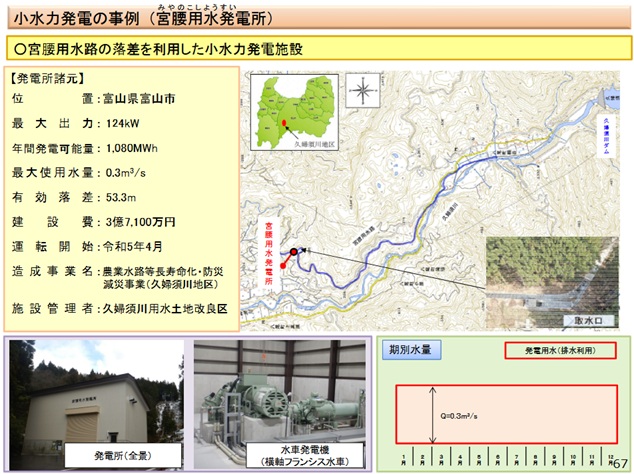 | ~宮腰用水~ 宮腰用水 取水:富 山市八尾町桐谷地先([農水省]によると取水口は272mのこれではなく262mのここらしい) 発電所名 宮腰用水発電所[水土里][農水省] 水系及び河川名 一級河川神通川水系久婦須川 所在地 富山市八尾町 宮腰 地内 発電方式 流込式 出力 最大123kW(124kW?) 使用水量 最大0.30m3/s 取水位 249.35m 放水位 194.55m 総落差 54.80m/有効落差 53.10m 年間可能発電電力量 1,029MWh 水車型式 横軸フランシス水車 発電機 横軸三相誘導発電機 出典:農水省 |