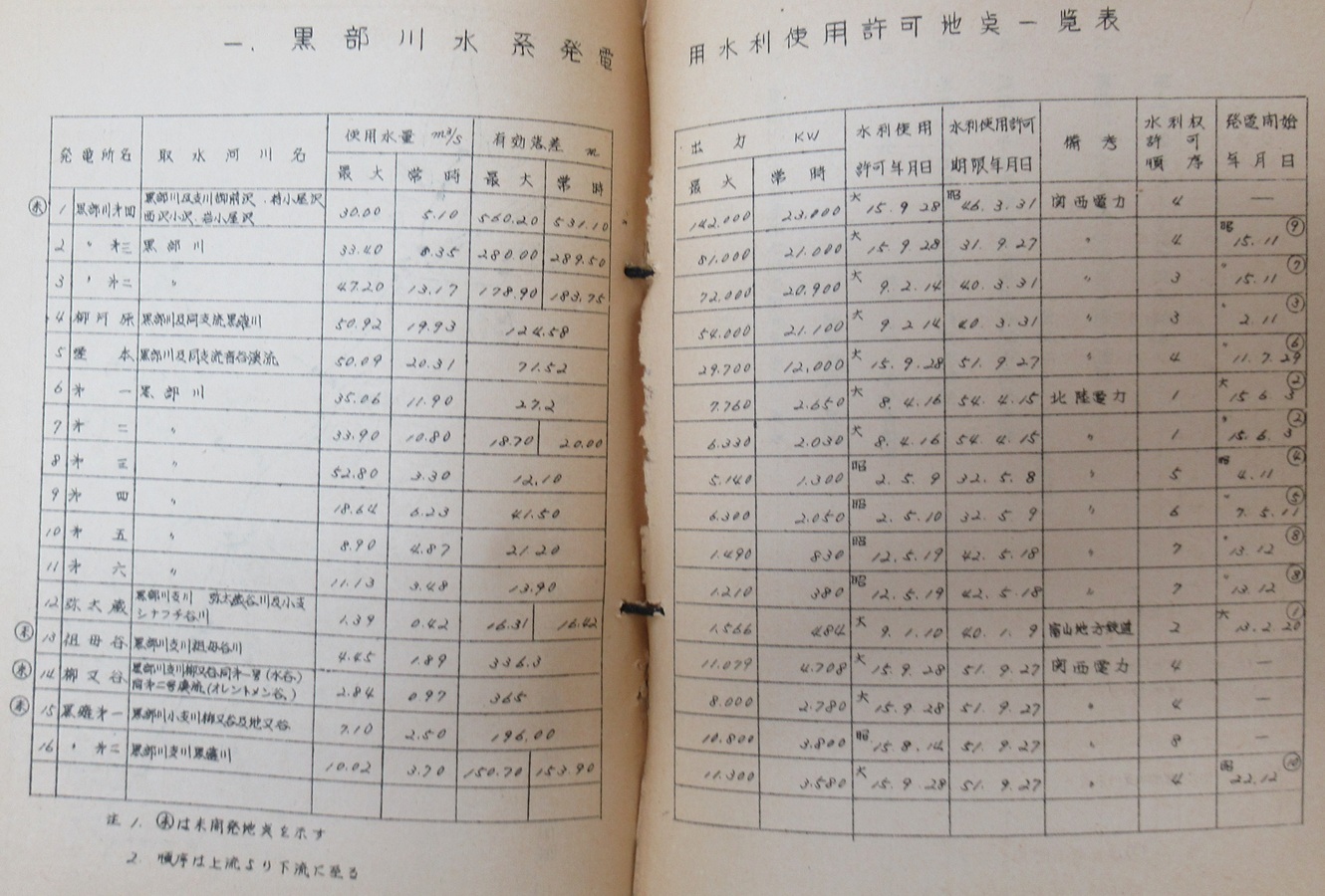 黒部川水系水利使用許可地点一覧表