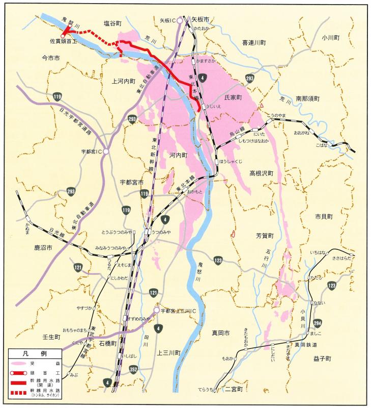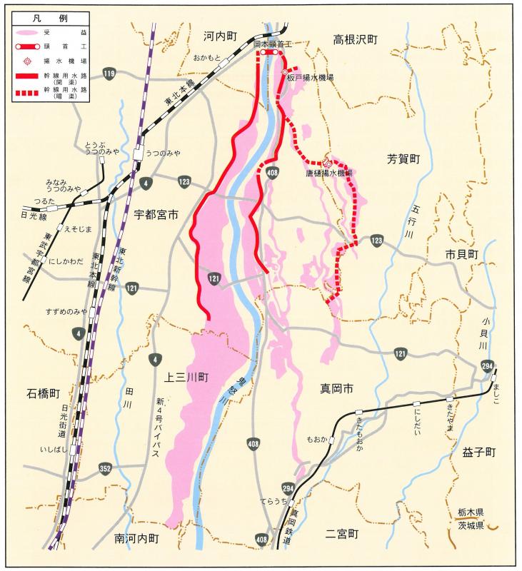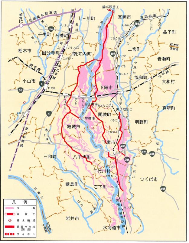 図2-2-1 鬼怒川における国営農業水利事業 1)鬼怒川中部農業水利事業 鬼怒川佐貫地点までの板穴川、大谷川等を含んだ上流ダム地点まで 図2-2-2 鬼怒川中部農業水利事業概要図 2)鬼怒中央農業水利事業 佐貫より下流、岡本地点まで 図2-2-3 鬼怒中央農業水利事業概要図 3)鬼怒川南部農業水利事業所 図2-2-4 鬼怒川南部農業水利事業概要図 国営鬼怒川南部農業水利事業 増加する水需要に対応するため、建設省が総合的な治水および利水対策として、鬼怒川上流にダムを建設しました。1956年(昭和31年)に五十里ダムが、 1966年(昭和41年)に川俣ダムが竣工しました。(鬼怒川南部農業水利事業完了後の1983年(昭和58年)には川治ダムが完成し、現在はこの三つの ダムを統合管理することにより鬼怒川の水位や流量の管理を行っています。) そこで農林省(現在の農林水産省)は、上流からの放流計画に合わせつつ地域の農業用水の需要を満たすために、水利施設の整備を行うことにしました。 |