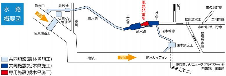 | 【下流開発篇】 [私案]佐貫発電所 出力:6,100〜8,200kW[+8.2MW] 水量:30.0〜40.0m3/s→下流の風見発電所はなんと42m3/sである! 落差:24m 導水:4.88km 取水:鬼怒川[大渡堰堤(道谷原発電所11.13m3/s・塩谷発電所18.00m3/s)]278m 放水:鬼怒川[佐貫頭首工]252m |
