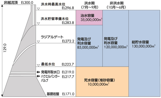 交省下久保(しもくぼ)ダム[水 力][便覧][→利根ダム篇] [関東地方整備局] ▲ (独法)水資源機構管轄 河川 利根川水系神流川 目的 FNWIP 堤高 129m 流域面積/湛水面積 322.9km2 ( 全て直接流域 ) /327ha 総貯水容量/有効貯水容量 1億3,000.0万m3/1億2,000.0万m3 ←でけえ! ダム事業者 関東地建→水公団一工 着手/竣工 1959/1968 夏期制限水位期 利水発電容量: 85,000,000立方メートル 標高 堤頂標高:300.00m 常時満水位標高:296.80m 夏期制限水位標高:283.80m 低水位標高:223.70m ダムの目的 1)洪水調節 治水容量3,500万m3を利用し、ダム地点の計画高水流量2,000m3/sのうち1,500m3/sの調節を行います。 2)流水の正常な機能の維持 利水容量(洪水期8,500万m3、非洪水期12,000万m3)を利用して、既得用水の安定化及び河川環境の保全等のための流量を確保します。 3)都市用水の供給 利水容量(洪水期8,500万m3、非洪水期12,000万m3)を利用して、東京都の上水道12.6m3/s及び埼玉県の上水道2.3m3/s、工業用水1.1m3/sの合計16.0m3/sの取水を可能にします。 4)発電 最大出力15,000kWの下久保発電所を新設し、発電を行います。また、下久保第二発電所を新設して最大出力270kWの発電を行います。 洪水調節図 △ ![]() 容量配分図 ![]() |
