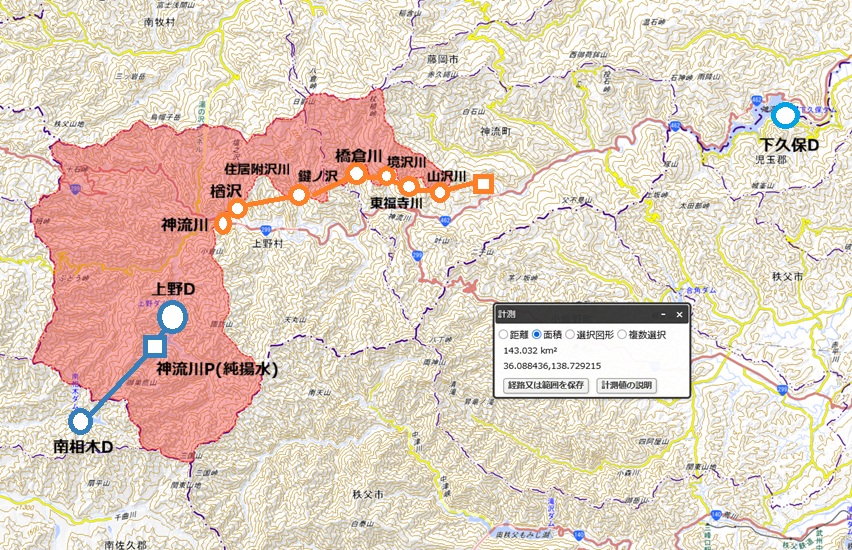 | 【神流川中流開発】 ▲ 先ず中流域を攻めると200m落差で140km2超とれた。もうここはこれで満足ではないか?(26,1案) ![]() [私案]中神流川発電所 出力:20,900kW[+20.9MW] 水量:12m3/s[0.83(1.67相当)] 落差:205m 導水:13.4km 流域:143;0km 取水:神 流川(579m) 楢 沢・住 居附沢・鏡ノ沢・橋 倉川・境 沢川・東 福寺川・山 沢川587m 放水:神 流川372m 適当な上流からダム湖畔に水をぶち込んで5,000kWぐらいの奴が欲しい。だいたい水量×落差が600が目途となる。 また送水距離も12km以内でないと5MWには厳しい。 ボツ案(23.9案)今,あれこれ調整して409mのここ,約13.65kmで到達。途中船子川で取水。さあ,流域面積120km2以上とれるか? 233.65km2。OKだ。面積比で個人的基準の半分でもこんだけ広いと10MW超えて来て導水距離の長さも目をつぶることができる。 [私案]中神流川発電所 出力:10,100kW[+10.1MW] 水量:11.6m3/s[0.50] 落差:105m 流域:233.65km2 導水:13.65km 取水:神 流川(叶山)・船 子川410m 放水:神流川[下久保ダム]満水位300m ![]() こ の辺(EL406m)の南側,叶山は秩父セメント(太平洋セメント)の石灰石鉱山あり。 さて同じ様なことをしつつ10km程遡ると上 野村楢原EL565m。 先 程の神流川(叶山)から150m程高度を稼いだので残るは面積である。4m3/sは欲しいので80km2以上有ればOK。 →118.9km2。OKだ。 [私案]上野発電所 出力:7,300kW[+7.3MW]~9,500kW[+9.5MW] 水量:5.9m3/s~7.5m3/s 落差:150m 流域:118.9km2 導水:10km (0.73) 取水:神 流川(楢原)EL565m。 放水:神 流川(叶山)410m |