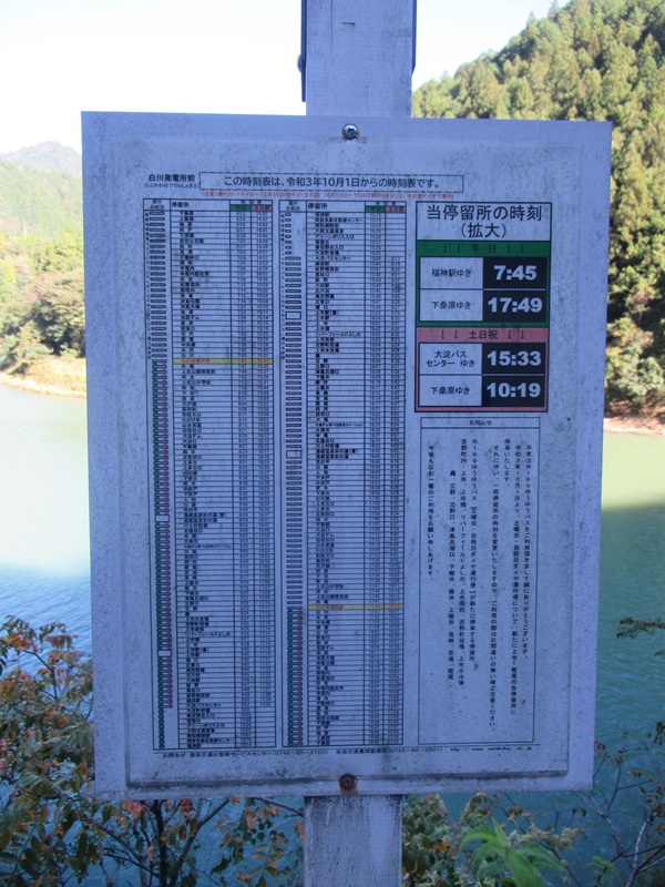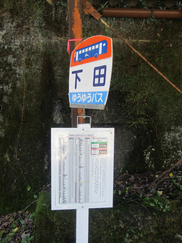 | この辺は下田という聚落らしくてバス停。 デザインが明らかに奈良交通(鹿写っちゃってますやんw)なのに「ゆうゆうバス」とか書いてある。 奈良交通が路線バスから撤退した後,コミュニティバスへの運行に移行した事が窺われる。 ![]() |