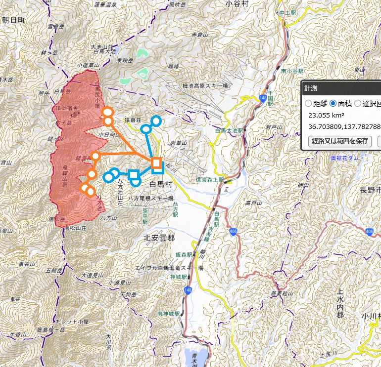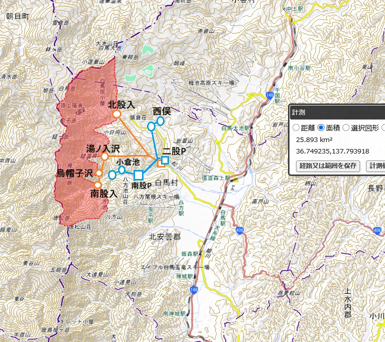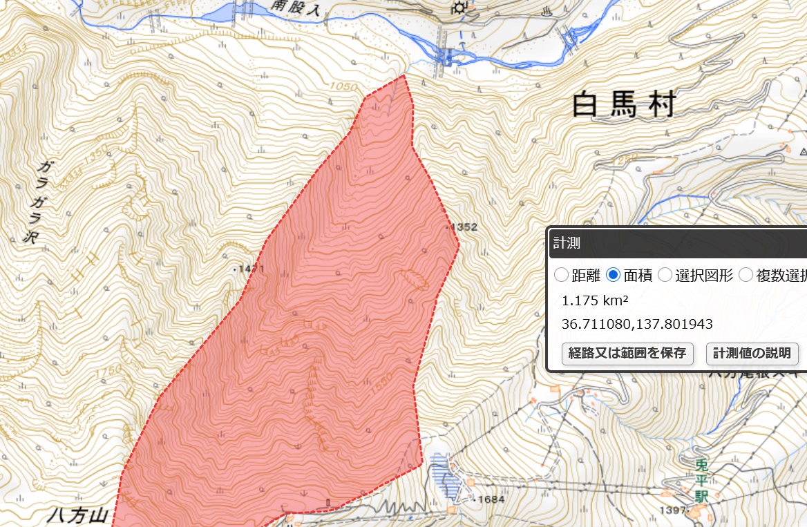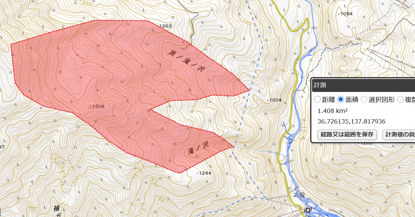 ~土谷川(日道沢・熊沢)合流(471m) ~ ~中谷川[姫川第三ダム付近で姫川に合流(453m)] ~ 上流に横川第二発電所の取水施設有り。 中谷川・土谷川650m地点から姫川第三ダム458mに落としてみた [仮称]中谷川発電所 出力:2,000kW 水量:2.5m3/s 落差:96m 面積:24.8km2 導水距離:7.7km (0.25) 取水:中 谷川・土 谷川658m 放水:姫川[姫川第三ダム] 458m ![]() 割りと満を持して取り掛かった心算だったけどあかんかった。。 上流を完璧に押さえられちゃってては一寸難しいか。。下で仕切り直し |