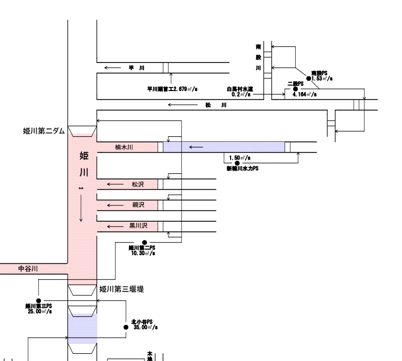 ~松川~ 南股発電所(南股堰堤) 二股発電所(松川堰堤) [私案]新二股発電所 松川も平川同様デカ目の支流の様である。平川よりも大きい様で既に発電所も立地している。 この二つの発電所は何れも1930年代の運開で水量も落差も現代的な観点からしょぼい。 と思ったら「信州Green電源拡大プロジェクト」で増強され,水量を増やさずに出力を増やしたらしい。 松川堰堤[DB] 中部電力(株) 目的:発電(二股発電所) 河川:松川(北股入・中山沢出合付近) 流域面積 (km2) 19.9(間接流域 の西俣(2.26km2)含まずの数字?) (ダム) 型式 コンクリート・重力式 (ダム) 堤高 (m) 2.44 (ダム) 堤頂長 (m) 36.61 (土砂吐) 型式 ローラ・ゲート 1門