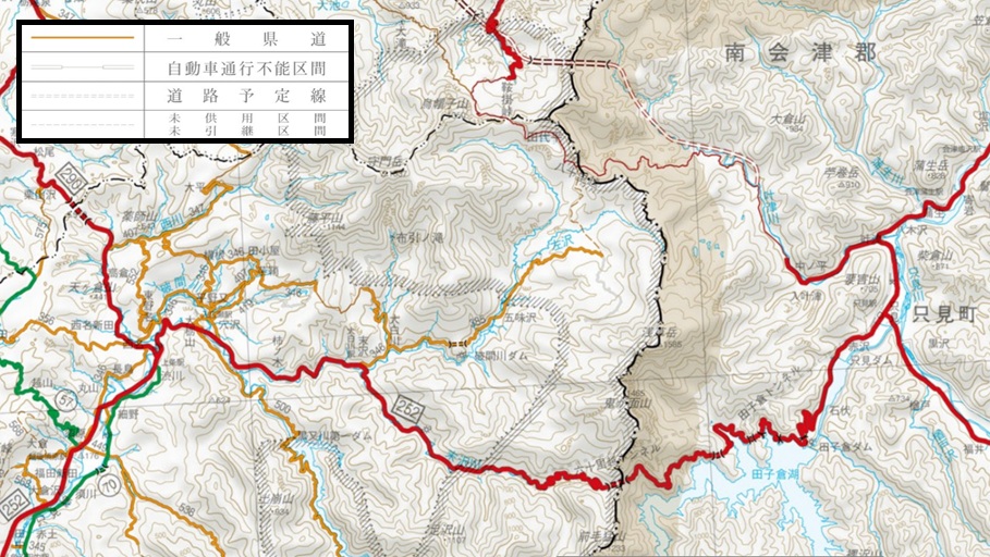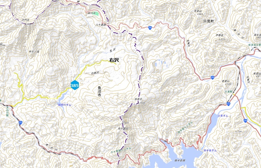 川停車場線】 ▲ 平石川上流の右沢にはr385浅草山大白川停車場線が並行する。 Googleカーは舗装区間末端で流石に引き替えている[→G] 地理院だとこ こら。県道指定は外れている様だ。 ヨッキが銀山平の頁かなんかで見つけてきた新潟県の県道図だが,これに拠ると計画線・未成線等も書き込まれており,これによるとr385は現道の指定から 外れた辺り[地 理院]の山道に沿って破線が描かれている。 この破線は凡例によれば未供用区間・未引継区間となっており,なんと八十里越えの峠迄(書類上は?)繋がってる模様! 詳しくはこ ちら[→道路族]で纏めた。 |