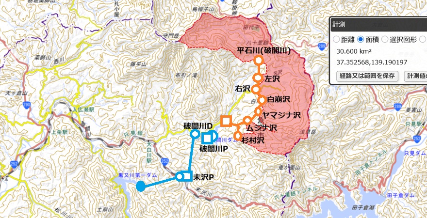 ▲ 今,その奥地,五味沢(今は破間川ダムのバックウォーター)に発電所を構想してみる。 [私案]五味沢発電所 出力:8,500kW[+8.5MW]~9,900kW 水量:4.8m3/s[1.59] 落差:210m 導水:6.6km+0.45km(村杉沢)=7.1km(+2.64km(夕沢~一本松沢=9.7km2)) 流域:30.6km2(+4.7km) 取水:破間(平石)川[堰堤(gsi)]・ 左沢(gsi)・ 右沢(gsi)・ 白崩沢[ヤスノ沢出合・堰堤](gsi)・ ヤジマナ沢(gsi)・ ムジナ沢(gsi)・ 村杉沢(gsi) (夕沢(gsi)・ 大高石沢(gsi)・ 一本松沢(gsi)) 660m 放水:平石川[破間川ダム]454m ![]() |