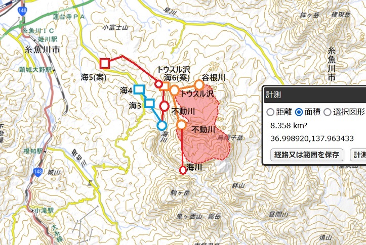 【下流部開発案】 ▲ 更に下流でももう一発ぐらい発電出来そうだが,折角なら使用水量の少ない第三の 救済策も兼ねたい。 ![]() [更新試案]海川第五発電所 or 新海川第一発電所 出力:7,100kW~8,000kW[+8.0MW] 水量:3.5m3/s 落差:239m~271m 流域:計38.1km2 海川30.2km2・不動川及トウスル沢7.9km2 導水: 取水:海川[海川第二PS]・不 動川・ト ウスル沢 335m 放水:海川60m~92m 出来ればEL60m位迄降ろしたいけど山の標高が335mもないので水圧鉄管の配置に工夫が必要となる。まあなんとでもなりそうだけど。 この335mに向けて発電出来そう。610m付近から取水。 水量:1.3m3/s・落差:265mで2.9MW程度の発電所を得る。 ![]() 規模は小さいし更に殆どの水はほっといても新第五で発電も出来るが,谷根川の水を(大した量では無いが)新たに加えることが出来る。 第五の投資効率を高めてくれそう。 ただもっと良い方策があって,不動川から2.4km伸ばせば其処はもう海 川本流なのである。海1・海2は 流域:24.7km2に対して水量がQ=2.59m3/s[1.05]とまだまだ行けそう。これを放置する手はない。 海川第一の取水後であるが,追加取水の余地大有りである。流域面積は海1に加えて0.91km2程。 3.5m3/s程度は見込んでも良いのではないか? ![]() [私案]海川第六発電所 or 新海川第二発電所 出力:7,900kW[+7.9MW] 水量:3.5m3/s[1.03]…海1と併せて34km2から合計6.1m3/s程度[1.79] 落差:265m 流域:8.36km2+25.6km2=34.0km2 導水:鉄管0.7km 水路3.5km(不動川・谷根川迄),2.4km(不動川~海川) 計6.6km 取水:谷 根川・ト ウスル沢・不 動川・海 川603m 放水:ト ウスル沢 335m |