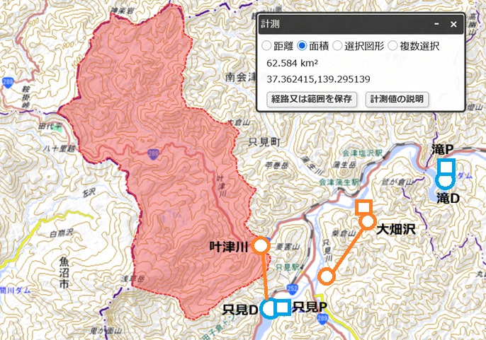 これを此処の只見システムに適応してみる。只見が田子倉の逆調整池である事を加味しても似たような感じである。 その為に先ずは只見ダムに水を集める。貯留量が200万m3と大した量は確保出来ないのでささやかにやる。 【叶津川導水路】 取水堰:叶津川(藤沢出合付近)EL400m 取水量:20m3/s位? 流域面積:62.6km2 ![]() 水を集めたら発電所である。放水口の謎はほぼ解けたので取水地点は伊南川との出合付近370mである。 【第二只見発電所諸元】 [私案]第二只見発電所 出力:48,000kw[+48.0MW] 水量:375.00m3/s 落差:15m 導水:3.7km 取水:只見川[只見発電所(370m)](伊南川との出合)・大畑沢川371m 放水:只見川[滝ダム354m](蒲生川出合)352m 「妙に綺麗なというか直線的な堤防で固められた只見川」が放水路(本流を改修)とすると取水工は伊南川との出合付近で良い。 導水路扱いして伊南川の河川改修とかして取水工が原因で溢水とか起こさない様に気をつけたい。 もし可能なら叶津川にダムも建設して治水もしつつ調整池としたい。只見ダムと同水位とすると田子倉の逆調整や上流(田子倉ダムの直接流域702.3km2 から只見ダムの直接流域)からの [私案]叶津ダム |