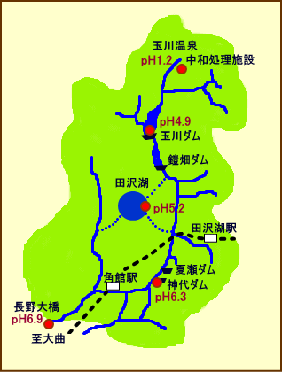 | ~渋黒川~ 大噴(おおぶけ・玉川温泉源泉)[東 北地方整備局] 毎分8400リットル(140L/s=0.14m3/s)、温度97℃、pH1.1の強酸性のお湯が自噴している。 下流のpH値 出典:東