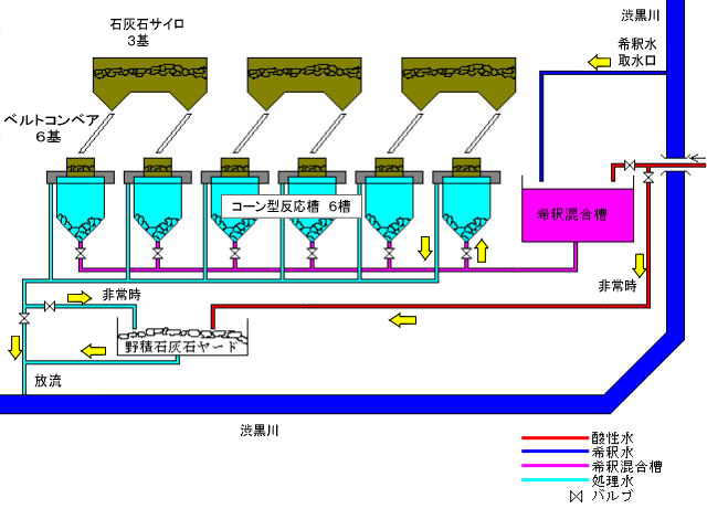 北地方整備局玉川酸性水中和処理施設[東 北地方整備局][場 所][G] 1)計画処理量 最大18,600㍑/分 2)接触時間 約5分 3)反応槽 コーン型6槽 (最大5槽運転1槽予備) 4)石灰石 5~20mm、CaCO3成分96%以上 使用量 16,170t/年(H21年) 5)適正酸度濃度 8.4Ax 4,000mg/l(CaCO3換算) 6)pH改善状況 原水 pH1.23 → 放流水 pH3.60(平 成21年度平均) 上の図だと玉川ダムでpH4.9とのことだが中和施設放流後は3.6とのこと。 施設