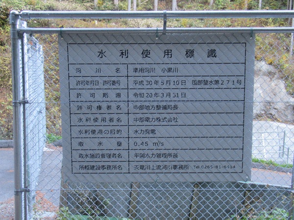 | ~小黒川~ その洞根橋からみた小黒川の黒川出合。 ![]() 小黒川沿いはまあ普通の山道である。この先何処にも通じてないのでそれ程テンションも上がらず粛々と駆け上がっていく。 小黒川のミズナラだそう。天然記念物とのこと。小黒川は「こぐろかわ」の様だ。 ![]() ![]() と,真新しい堰堤が登場!テンションがあがる。 ![]() 利水票もゲッと。0.45m3/s。ちいせえ,,, ![]() 真新しい取水設備。 ![]() ここで取水した水が地下トンネルに吸い込まれていく(と思われる)。 ![]() ![]() [新設]小黒川堰堤 ▲ 目的:発電(清内路発電所) 取水:0.45m3/s 流域:5.5km2(とは調べ) 取水位:1047.0m程度?(gsi) ![]() 取水前の水量 ![]() 小黒川線標識 ![]() 砂地場沢の砂地場橋辺り迄行って適当に引き返してきた。グーグルは此 処迄入っている。車道の末端っぽい。 |