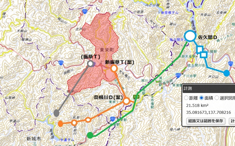入・東薗目導水 この二河川からは佐久間ダムへ導水出来そう。新豊根へは狭すぎるのでボツ。 ![]() もしくは相川ダムを建設するならそっちに持ってけるかもしれない。標高が低い分一寸だけ多く取れる。この場合新振草頭首工経由となる。 ![]() いずれにせよこ の辺(佐久間)やこの辺(相川)で検討。大千瀬ダム(案)なら導水は不要であ る。 |