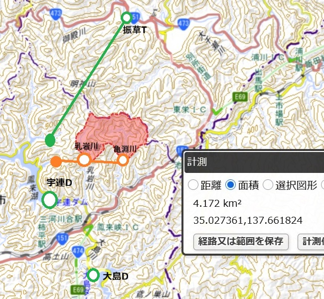 | ~大千瀬川二次支流河内川~ ▲ 山の中にある大入トンネル流出工[正 しい場所(地理院)・恐 らくこれ(G)]→地理院はなんとこ こ(EL.540m) に放水口を描いてるけど取水先(の大入頭首工)で すらEL.518m 程度であり,明らかに可怪しい。此処でも地下水路に弱い地理院が間違っていると云える。 上の取水口で取り込まれた水は太金和峠をトンネルで越えて先 程の此処ら(EL.506m付近)で河内川に放流される。 21.1施設名は近くの看板より。 ![]() 近くには別所街道が走っており,その旧道沿いに流出工は存在する。2023.2の時点でも地理院だと普通に国道指定の侭でしかも現役となっている旧道トン ネルだけど既に塞がれていた。 ![]() 河内川は一旦鴨山川へ合流してから大千瀬川に合流する。 ~大千瀬川(振草川??)~(→この辺も 参照) ▲ 大千瀬川は御殿川等と合流して中設楽に至り,ここでもう一度取水される。振草頭首工であるが立地は中設楽で振 草にはないようだ。。中設楽ってのも郡名を背負うデカい地名であるが。。(相楽(そうらく)郡,今の木津川市の相楽(さがなか)を思い出す。) 頭首工の重要な意義づけの為にも中設楽頭首工とかが良かったのではないか!? ふと思ったが,ちゃんと豊川ではなく寒狭川頭首工と名付ける豊川用水なのでここも正式には(=地元では,という意味・法律なんか糞喰らえであるw)振草川 なんか?!→東栄町内の漁協が振草川漁協だったし遠江側が大千瀬川,三河側が振草川かな~。→どうもそうらしい。別所の街中の(古い)橋の川の名前の場所に振草川とあった[→大千瀬本篇]。 場所に寄って名前が変わるのは解りにくいから,せめて大入川と振草川が合流して大千瀬川とか法的に整理できないものか(まあこれやりだすとややこしくなる のかw)。 振草頭首工(大千瀬川中流)[水 資源][水 資源] ▲ 位置 愛知県北設楽郡東栄町大字中設楽 流域面積 72.64 km 2 下流補償流量 1.44 m 3/s 取水量 最大 15.00 m3/s 構造 可動型コンクリート堰提 堰長 34.0 m ゲート高 2.5 m 導水路延長 6.1 km 流域面積 72.64 km2 →大入頭首工から5m3/sの流入があるとは云え,72.64km2の流域面積で15.0m3/s,詰まり大千瀬川流域からは実質10m3/sはそこそこ 多い取水量である。(138%水準)これは洪水時に発電を停止したりする流込式発電所とは違って出水時の水を貯水池に貯めて置くという運用ということのよ うである。そういう意味では控えめではある。 下流補償流量 1.44 m3/s 振草導水15m3/s 利水標識: 21.1/22.5銘板より: 豊川用水流域変更 振草頭首工 昭和43年3月竣工 形式 フィックスドタイプ全可動セキ セキ上高 4.6m セキ長 40.0m 土砂吐 6.0m×4.3m ローラーゲート1門 洪水吐 25.0m×2.5m 起伏開閉ゲート1門 放水口 2.0m×2.0m 起伏開閉ゲート1門 魚道 2.0m×38.0m 勾配12% 取水施設 3.0m×2.6m ローラーゲート3門 21年の正月早々に訪問したのだが,冬期で水が不要なせいかゲートを倒して一切取水してない様子であった。 2回目は22.5に訪問してみた。 堰堤(マウスオーバーで21.1) 22.5取水口(マウスオーバーで21.1) 22.5湖面と魚道 22.5振草は1.44m3/s,大入は2.61 m3/sの下流補償流量があるということはそれ以下の水量が殆どとなる冬期渇水期は事実上閉じっぱなしで活動を休止するのかも知れない。大雪とか降って流 水量が 上がることもあるだろうけど,融雪の流水は穏やかで一気には増えないし,季節外れの大雨だったとしても待ち構えて水門上げて減ったらすぐ下げるみたいなこ まめな操作ってのは難しいのかも知れない。 とまあ結論めいたものを得た二回の訪問だったが,段々帰省の前後の行く先が無くなってきて延々とR151を北上する事も多くなってきたので定点観測を兼ね て23.7に寄ってみた。梅雨も後半の雨上がりの日であったが,なんとゲートが上がっていた。。大千瀬川の水で発電出来るタイミングも多いのかもしれない [→この辺で検討]。
