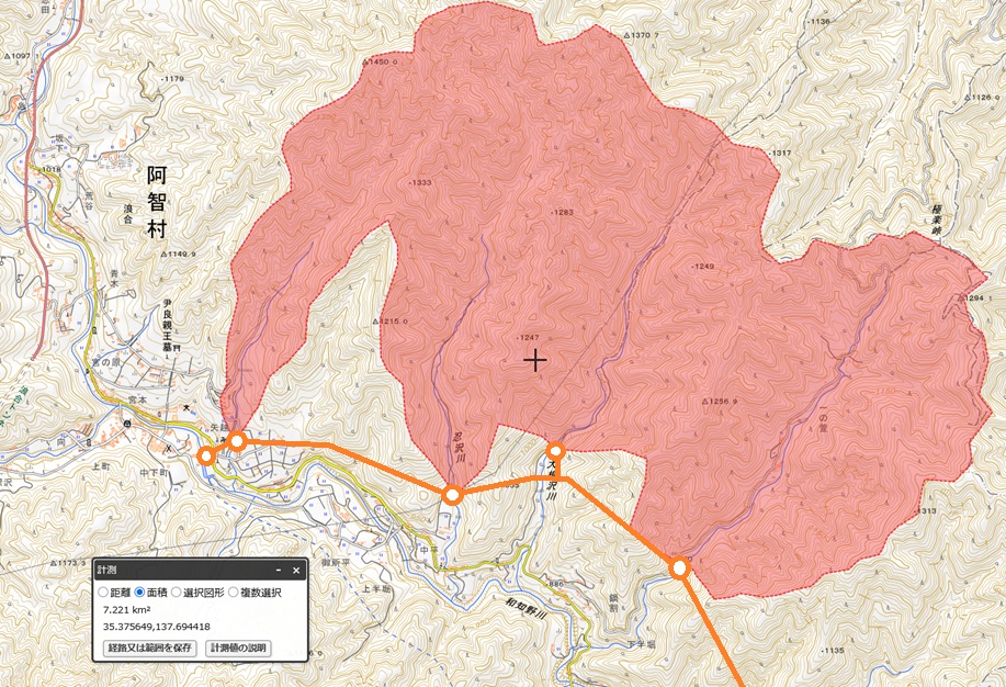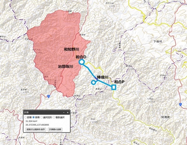 【和合発電所増強(案)】 △ ▲ [私案]新和合発電所 出力:6,600kW[+6.6MW] 水量:4.00m3/s 落差:195m 導水:5.0km 流域:浪合堰堤31.5km2・支流:7.2km2 取水:和知野川[浪合堰堤(こ の辺)]・沢・忍 沢・大 根沢・下 り沢(Q)936m 放水:和知野川[和合堰堤]734.5m 導路 ![]() 流域 ![]() |