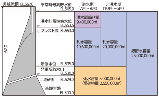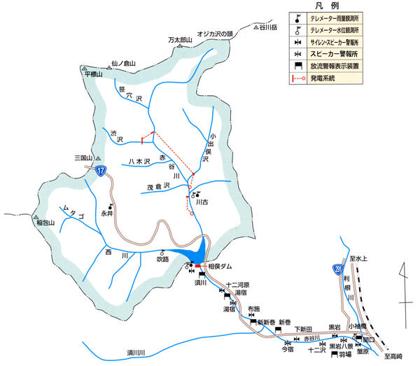 備局]渋沢取水堰堤[関東地方整 備局] 赤谷川取水堰堤[DB] (主要取水設備) 高さ (m) 8.00 (主要取水設備) 堤頂長 (m) 3.00 (制水門) 型式 ローラ・ゲート (制水門) 門数 (門) 1 (制水門) 径間(口径) (m) 3.20 (制水門) 高さ (m) 2.25 大出又沢調整池[DB]→ 大出又沢の位置不明。。流域面積的には小出俣沢にあるこ れ(gsi) ダム所有者 東京発電 流域面積 (km2) 10.9 東京発電(株) 赤谷川第二発電所[水力][DB] 所在地:群馬県利根郡みなかみ町相俣 昭和35(1960)年10月26日:運用開始 水路式・調整池式 認可最大出力:3,100kW 常時出力: 100kW 最大使用水量:3.40m3/s 有効落差:111.50m 導水路: 総延長4,610.0m 主要導水路: 圧力トンネル 1,164.2m 幅×高さ 1.65m×1.65m 放水路:12.9m 横×高さ 2.04m×1.63m 水圧鉄管(管胴): 1条 234.66m 水車: 立軸フランシス 1台 総出力(定格) 3,400kW 流域面積:39.5km2 取水:渋沢→赤谷川→小出俣沢 3箇所735m 放水:赤谷川[赤三調整池]618.5m 赤三調整池(あかさんちょうせいち)[週末][便覧][マニア][kiss.f5][DB] 河川 利根川水系赤谷川 目的/型式 P/重力式コンクリート 堤高/堤頂長/堤体積 17.1m/27.2m [便覧] 堤高/堤頂長/堤頂巾:19.10m/17.00m/3.00m[DB] 流域面積/湛水面積 55.6km2 ( 全て直接流域 ) /2ha 総貯水容量/有効貯水容量 26千m3/24千m3 ダム事業者 東京発電(株) 着手/竣工 1958/1961 洪水吐 クレスト ローラ・ゲート2門 径間(口径)×高さ:9.40m×4.00m 主要取水設備 高さ/堤頂長: 1.60m/7.00m 制水門 ローラ・ゲート 1門 径間(口径)×高さ 3.36m×2.38m 東京発電(株) 発電所名:赤谷川第三発電所(あかやがわ3)[DB] [kiss.f5] 群馬県みなかみ町 運開;1961.12 水路式・調整池式 最大出力 (kW) 2,400 常時出力 (kW) 140 最大使用水量 (m3/s) 5.00 有効落差 (m) 57.00 導水路:総延長1,732.6m 圧力トンネル 放水路:総延長 128.4m 水圧鉄管(管胴):1条 119.68m 水車 立軸フランシス 1台 総出力(定格)2,500kW 取水;赤谷川[赤三調整池] 1箇所 618.50m 放水;赤谷川[相俣ダム(満水位565m)・相俣ダム建設で廃止された発電所の調整池跡?(こ れ)] 557.65m 相俣ダム[kiss.f5][便覧][関東地方整 備局] 河川 利根川水系赤谷川 目的 FNP 堤高/堤頂長 67m/80m 流域面積/湛水面積 110.8km2 ( 全て直接流域 ) /98ha 総貯水容量/有効貯水容量 25000千m3/2,000.0万m3 ダム事業者 関東地方建設局 着手/竣工 1952/1959[→詳細] ダム湖名 赤谷湖 (あかやこ) 普通ローラゲート 径間5.0m×高さ13.0m 2門 スライドゲート(修理用) 径間5.0m×1.655m 1門 >相俣ダムは赤谷川に位置する重力式コンクリートダムで、群馬県により1953(昭和28)年から建設されましたが、1956(昭和31)年試験湛水中に発生した左岸台地部 からの漏水により、建設省(現国土交通省)へ移管され、1957(昭和32)年から相俣ダム二期工事として、相俣工事事務所(後に相俣ダム工事事務所に改名)により漏 水防止工事などを実施して、1958(昭和34)年に竣工し、相俣ダム管理所により管理が開始され、その後、1964(昭和39)年4月藤原ダムとともに利根川ダム統合管理事務所 の管理となりました。[関東地方整 備局] 出典:関東地方整